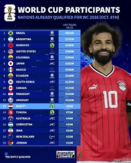 北京时间10月9日消息,随着埃及提前一轮从世预赛非洲区出线,已经有三支非洲球队锁定了明年美加墨的世界杯席位,共19队已经确定晋级2026世界杯正赛。根据德国转会市场的最新数据,在已经确定晋级世界杯的19队中,巴西国家队总身价居首,卫冕冠军